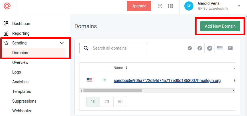 In der Mailgun-Weboberfläche wählst du im linken Menü "Sending/Domains" aus. Mit einem Klick auf "Add New Domain" kannst du eine Domäne für den E-Mail-Versand hinzufügen.