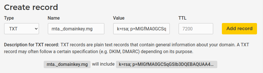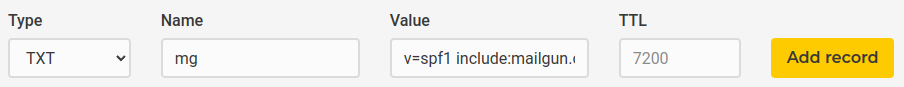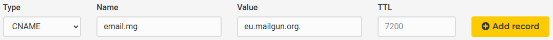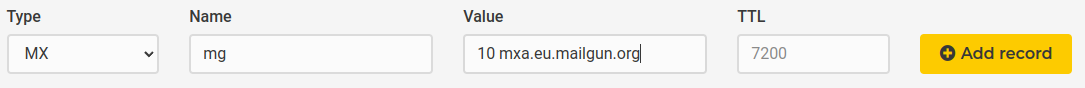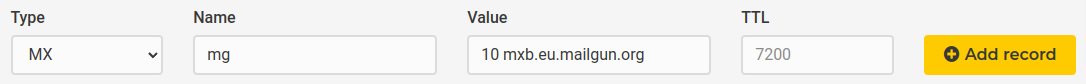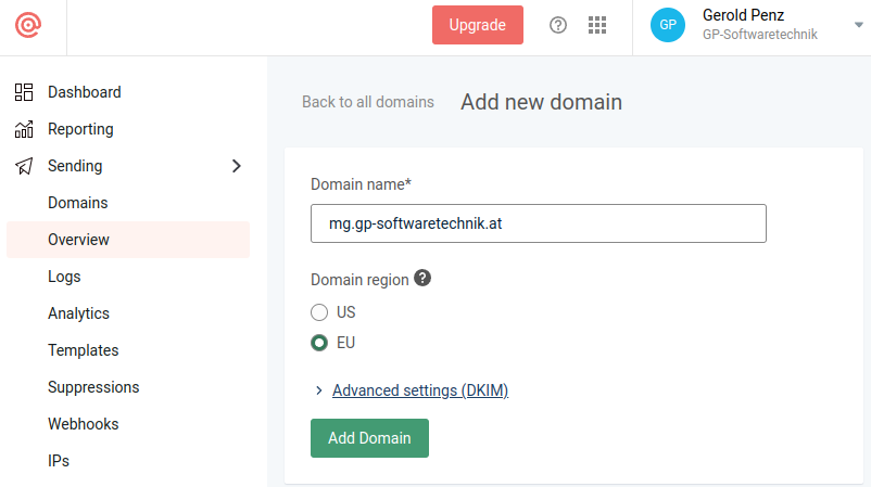 Was kommt ins Feld "Domain name"? Um dir das erklären zu können, muss ich ein wenig ausholen. Meine Ghost Homepage ist unter der URL "https://gp-softwaretechnik.at/" erreichbar. Meine Domäne für Ghost ist also "gp-softwaretechnik.at". Ich habe mich dafür entschieden, Mailgun über die noch nicht erstellte Subdomain "mg.gp-softwaretechnik.at" die Erlaubnis zum Versenden zu geben. Eine Subdomain zu verwenden ist wichtig, da du ansonsten deine vorhandenen MX-Einträge ändern würdest und das könnte dazu führen, dass du keine E-Mails mehr empfangen kannst. Um das klarzustellen, in diesem Moment gibt es die Subdomain "mg.gp-softwaretechnik.at" noch nicht. Und um noch etwas klarzustellen, du kannst auch deine Ghost Domäne ohne zusätzliche Subdomain verwenden, wenn du weißt, was du machst.