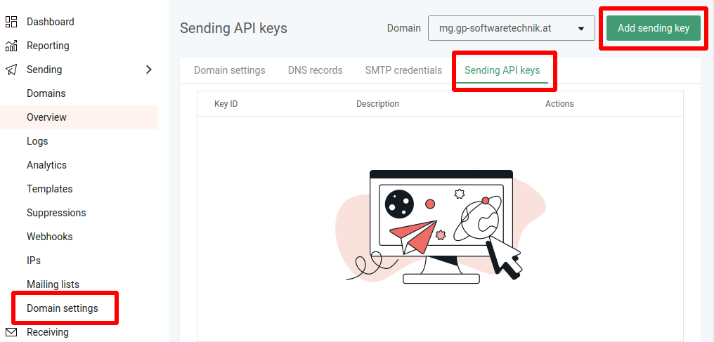 Ein Klick im Hauptmenü auf "Domain settings" und auf den "Sending API keys"-Tab bringt dich hier hin.