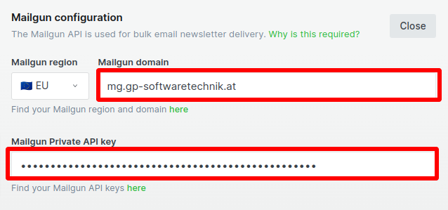 In Ghost stellst du den API-Key unter "Settings/Email newsletter" ein. Ganz unten findest du den Block "Mailgun configuration".
