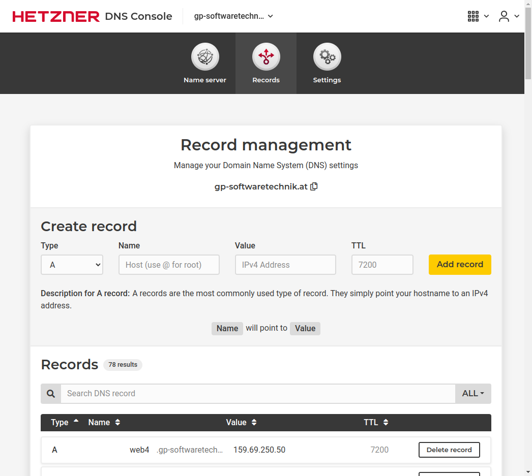 An dieser Stelle kann ich dir nur Bilder zeigen, wie ich es bei Hetzner mache. Dafür öffne ich die DNS Console und wähle die Domäne "gp-softwaretechnik.at" aus.