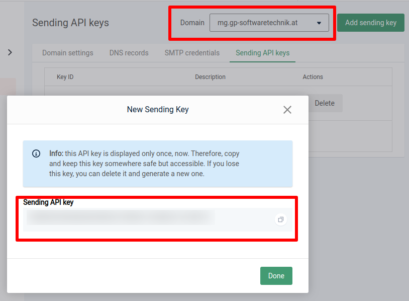 Mit "Create sending key" wird der neue Key erstellt. Achtung, der Key wird dir aus Sicherheitsgründen nur einmal angezeigt. Kopiere ihn dir am besten sofort in eine Textdatei und speichere ihn an einem sicheren Ort.
