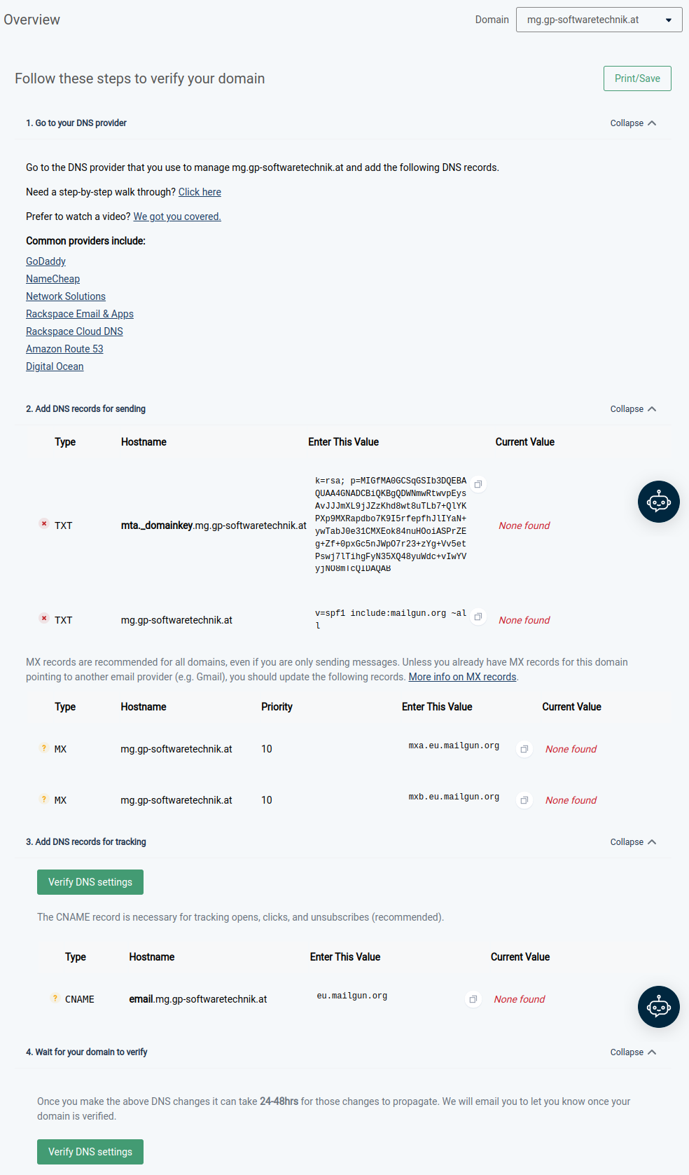 Es kann lange dauern, bis die neuen Einstellungen aktiv werden. In meinem Fall bis zu zwei Stunden. Du kannst Mailgun auffordern, vorzeitig eine Prüfung der Einstellungen durchzuführen. Klicke dazu auf "Verify DNS settings".
