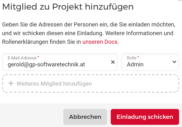 Ein Klick auf die "Mitglied hinzufügen"-Schaltfläche öffnet ein neues Dialogfenster, in dem du Personen zum Projekt einladen kannst. Falls du mich hinzufügen möchtest, gib bitte als E-Mail-Adresse gerold@gp-softwaretechnik.at und als Rolle "Admin" ein.