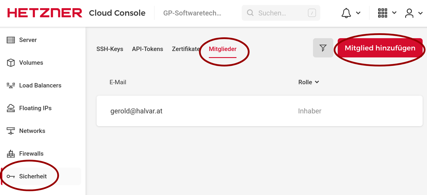 Falls du mich als Admin hinzugefügt hast, bekomme ich jetzt ein E-Mail, in dem ich die Einladung annehmen kann. Sobald ich die Einladung angenommen habe, bin ich als Benutzer "gerold@gp-softwaretechnik.at" in der Lage, neue vServer zum Projekt hinzuzufügen und zu konfigurieren.