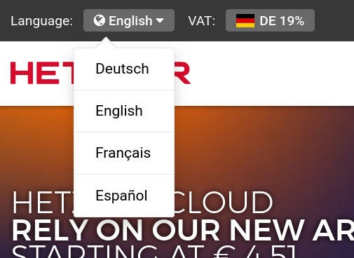 Mit einem Klick auf die "Fortsetzen"-Schaltfläche kommst du zur Startseite von Hetzner. Links oben kannst du die Sprache auf Deutsch umstellen.
